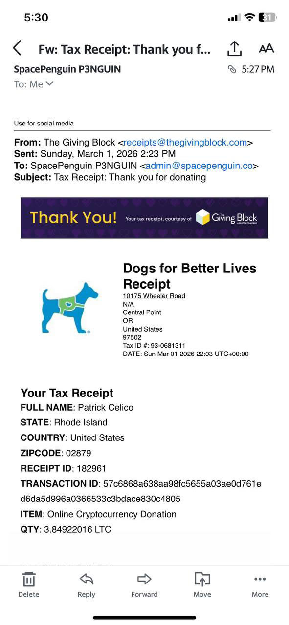 ✓ $208 USD (3.85 LTC) donated to Dogs For Better Lives on 2026 Mar 1st.