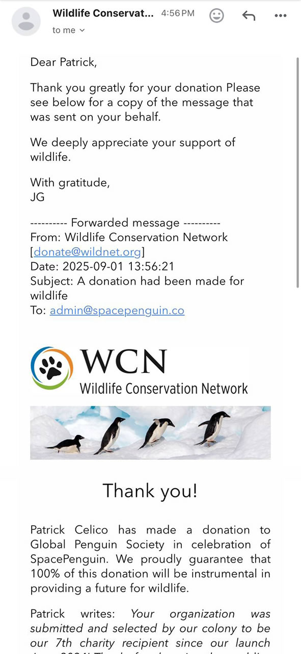 ✓ $202 USD donated to Global Penguin Society on 2025 Sep 1st.
