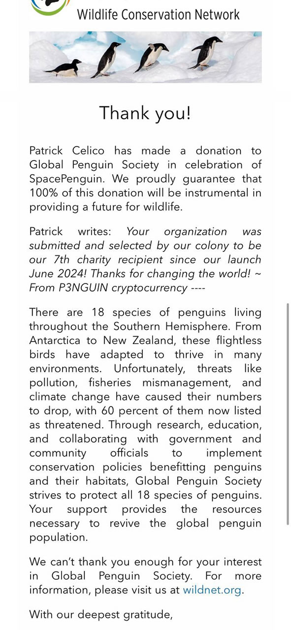 ✓ $525 USD donated to Global Penguin Society on 2024 Nov 18th.
