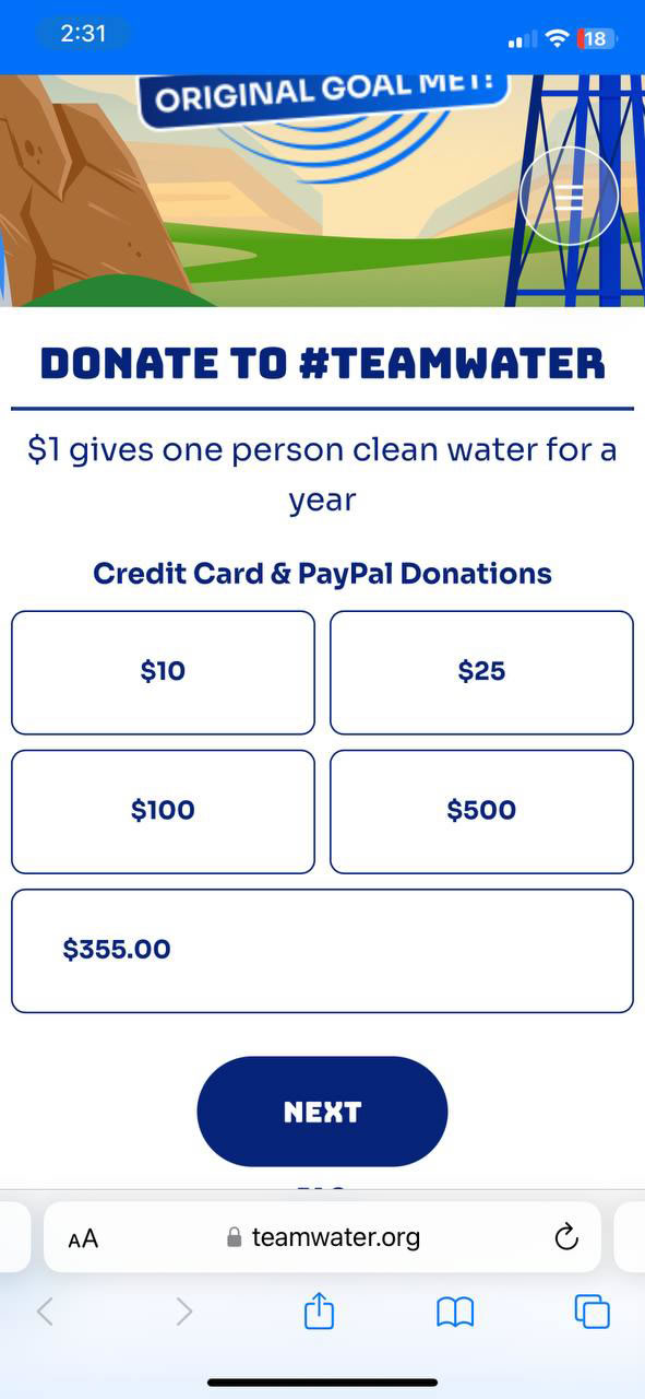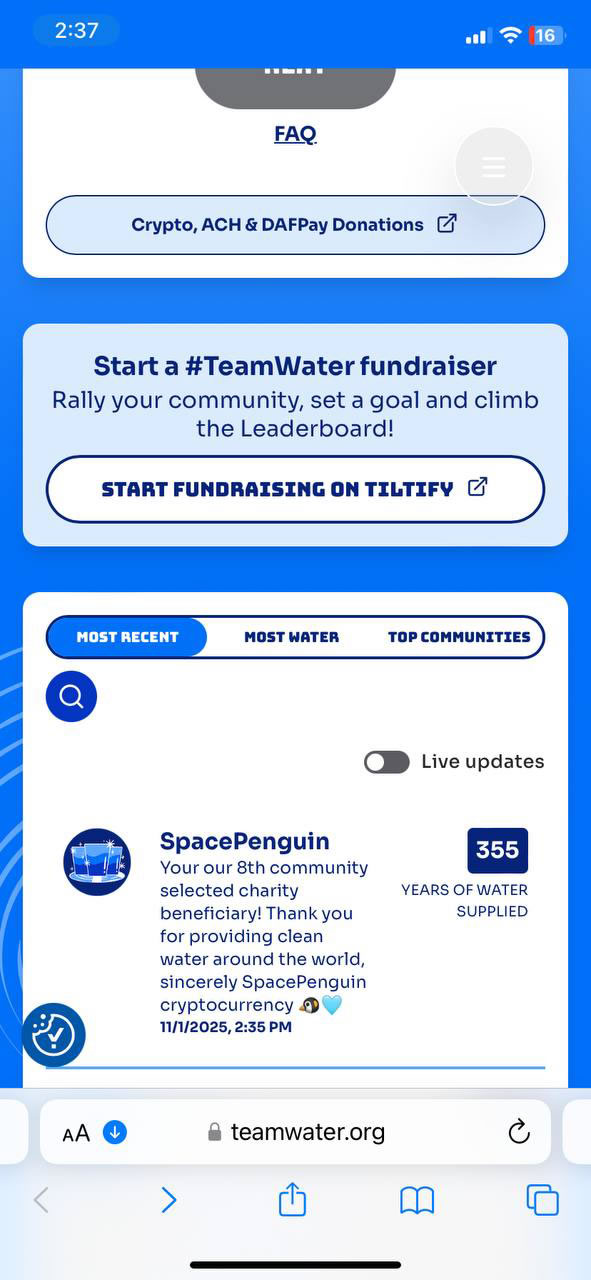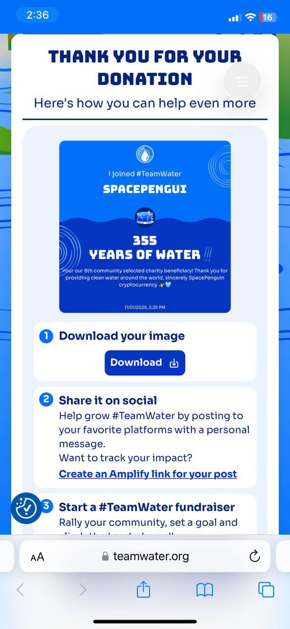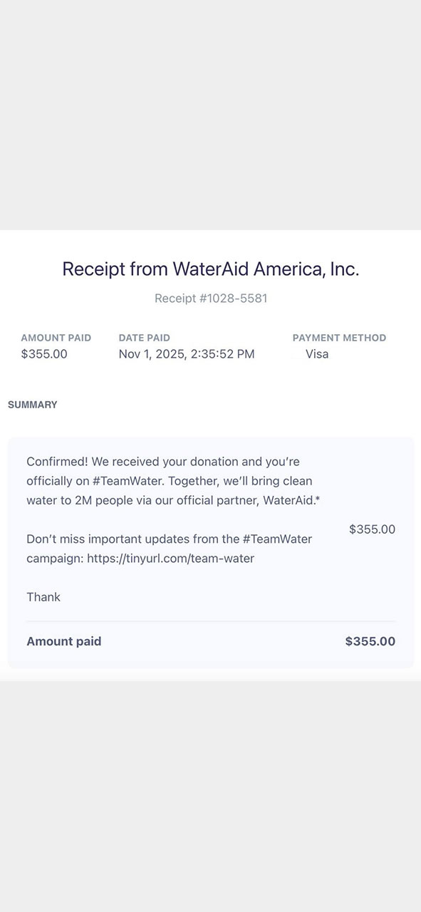 ✓ $355 USD donated to #TeamWater on 2025 Nov 1st.