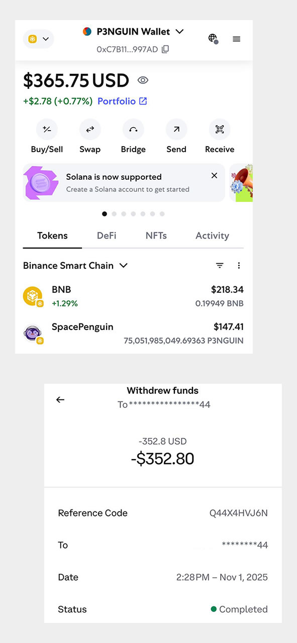 ✓ 75 051 985 049 $P3NGUIN + 0.19949 $BNB collected & converted.